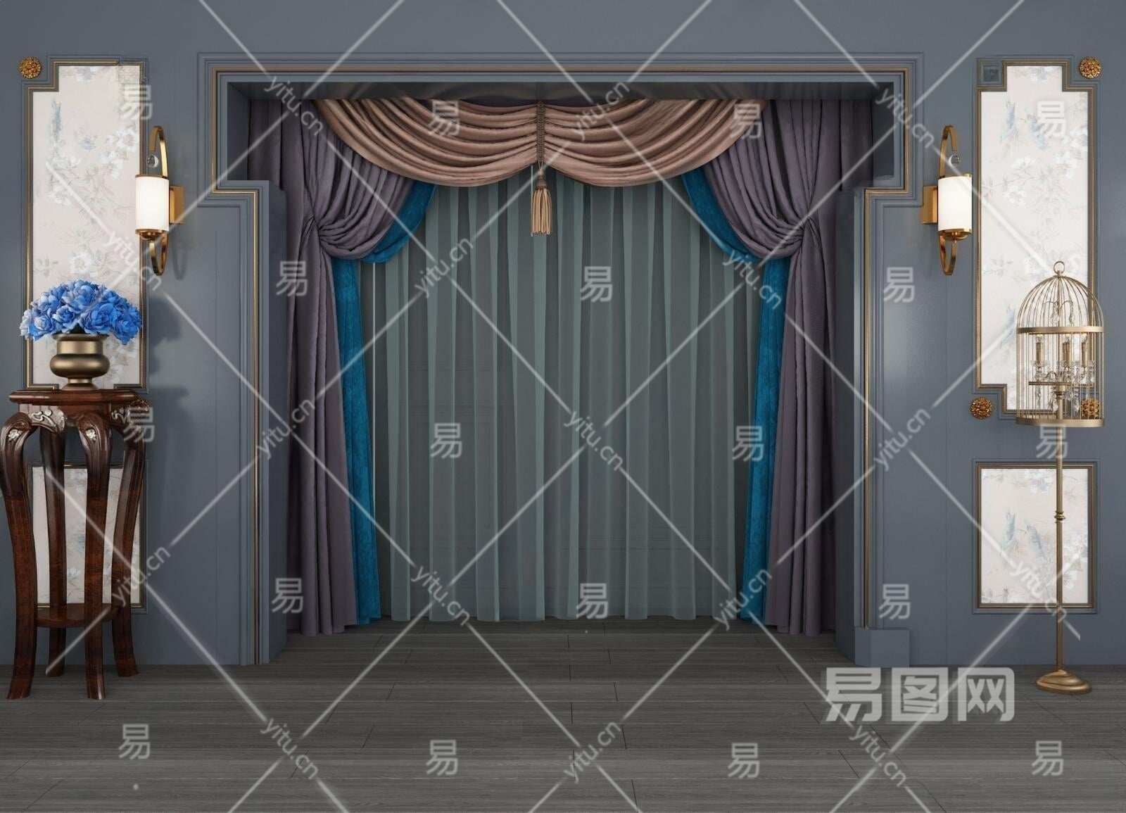 欧式古典欧式布艺窗帘窗纱门拱门洞盆景摆件壁灯组合3D模型下载