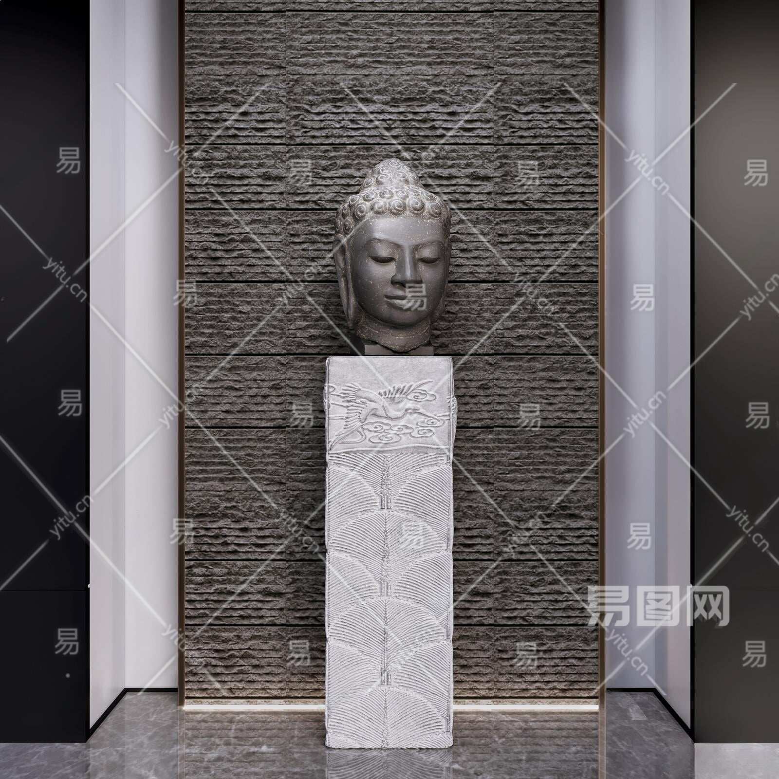 新中式佛头雕塑装置3D模型下载