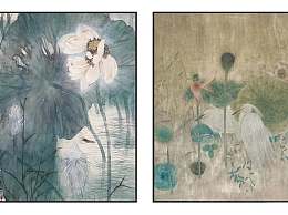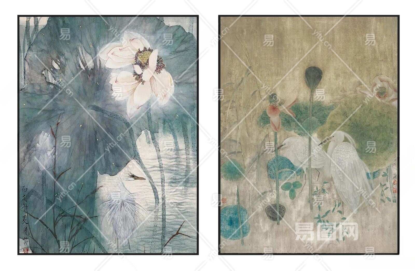 新中式灰蓝绿色荷花白鹭挂画组合3D模型下载