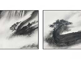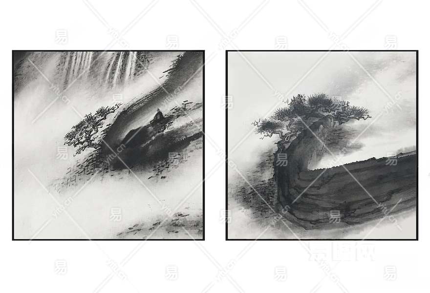 新中式黑白灰水墨意境山峰松树挂画组合3D模型下载