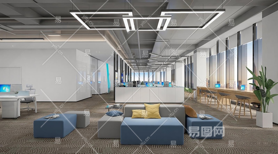 现代开敞办公区3D模型下载