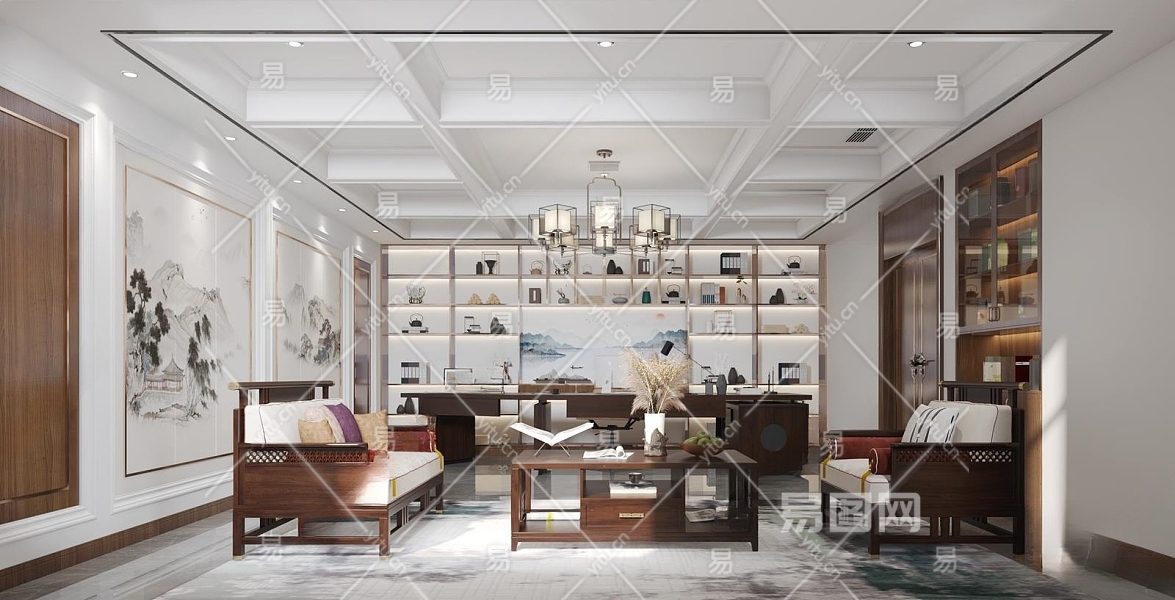 新中式总经理办公室3D模型下载