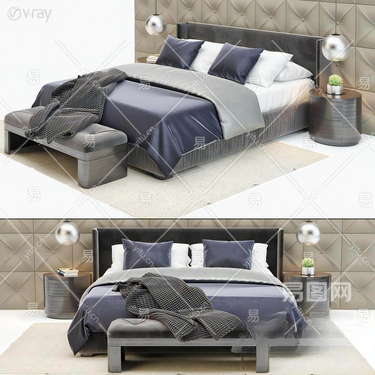 当前的位置:首页 > 3D模型 > 床具 > 双人床 > 现代双人床 床头柜 地毯 床品 抱枕 装饰摆件 饰品摆件 台灯