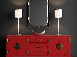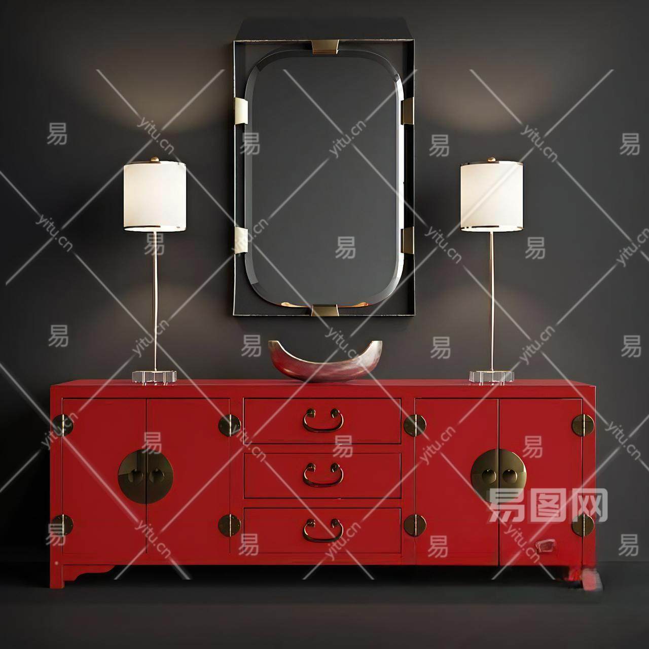 中式装饰柜 边柜 矮柜 镜子 台灯