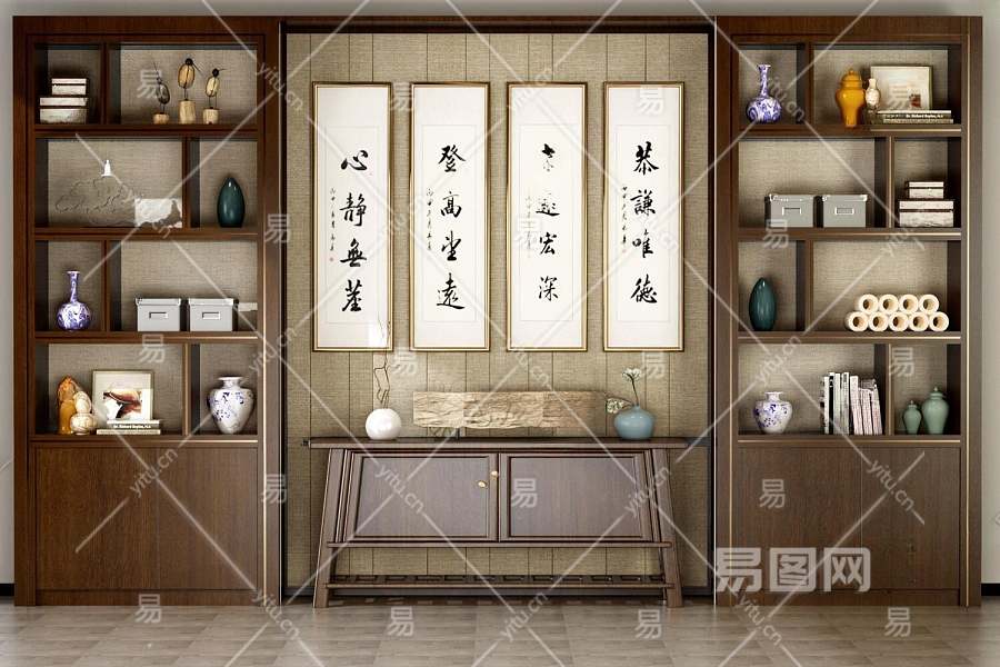 新中式中式书柜3D模型下载