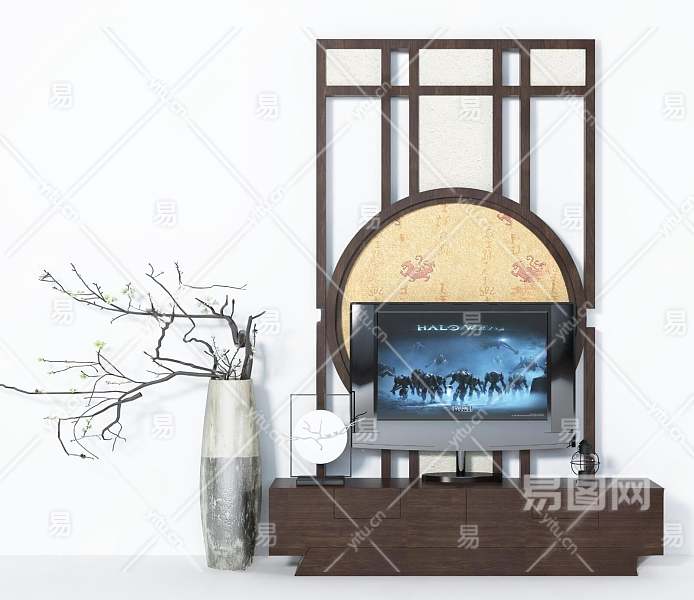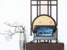 新中式电视柜干支摆件背景墙3D模型下载