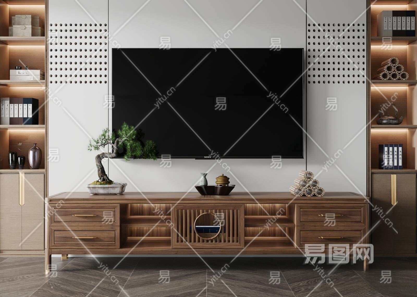 新中式电视柜3D模型下载