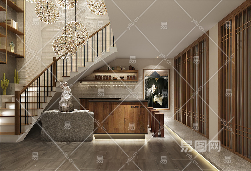 当前的位置:首页 > 3D模型 > 家装空间 > 茶室 > 新中式别墅转角酒吧 茶水室 楼梯 装饰画 吊灯