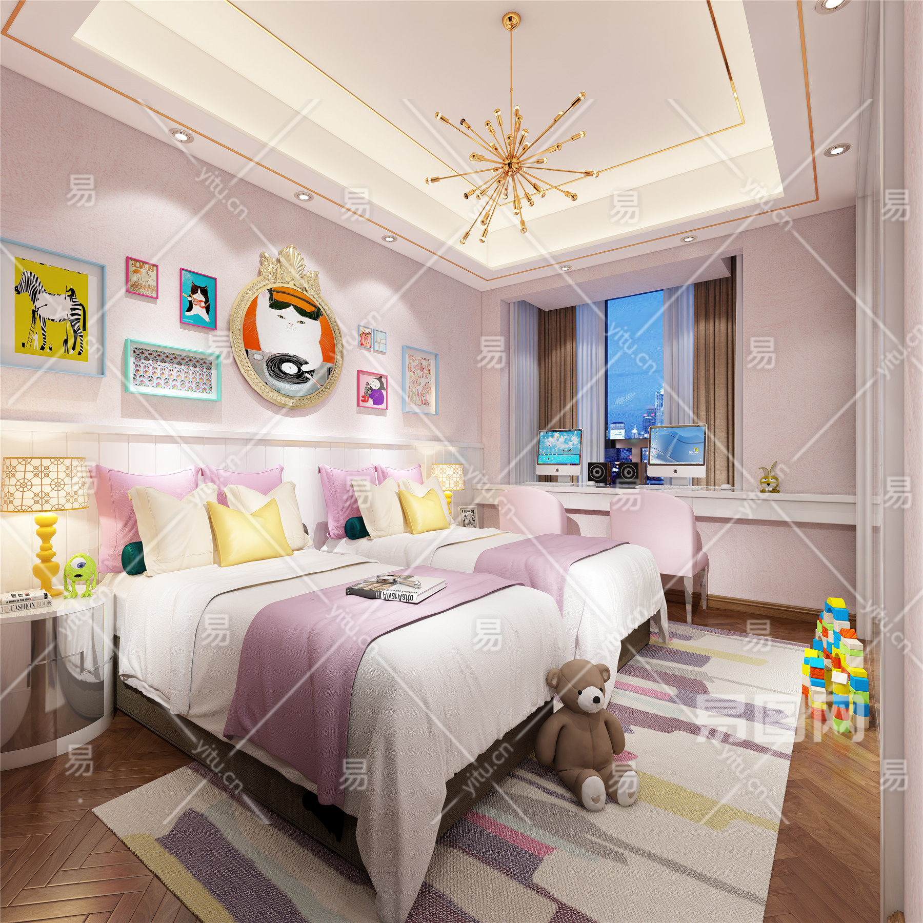 现代简约小孩房 双人床 单人床 床 床头柜 吊灯 壁灯-1