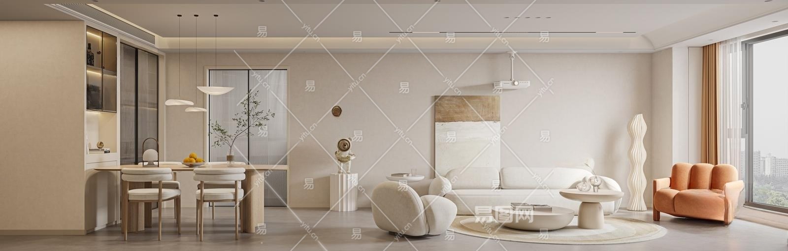 现代奶油风客餐厅3D模型下载