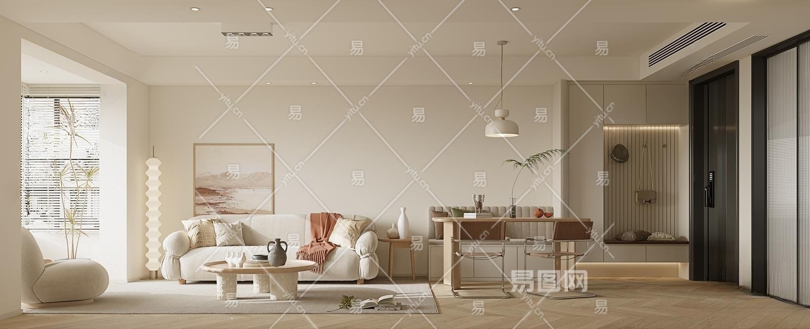 现代奶油风客餐厅3D模型下载