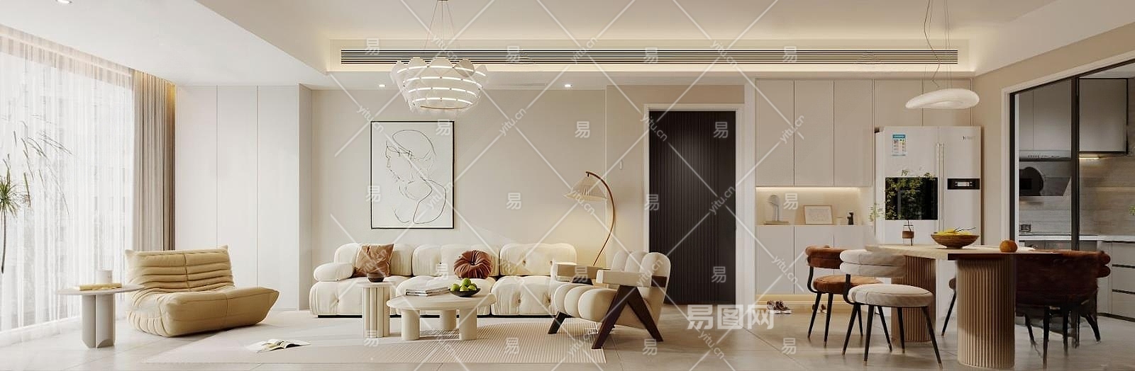 现代奶油风客餐厅3D模型下载