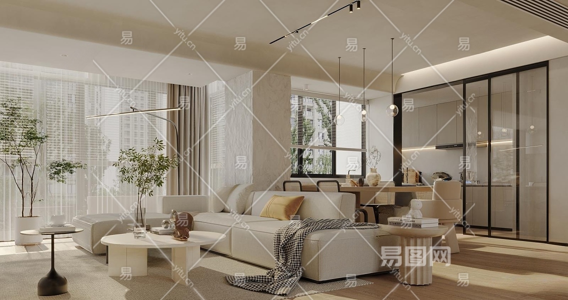 现代奶油色客餐厅3D模型下载