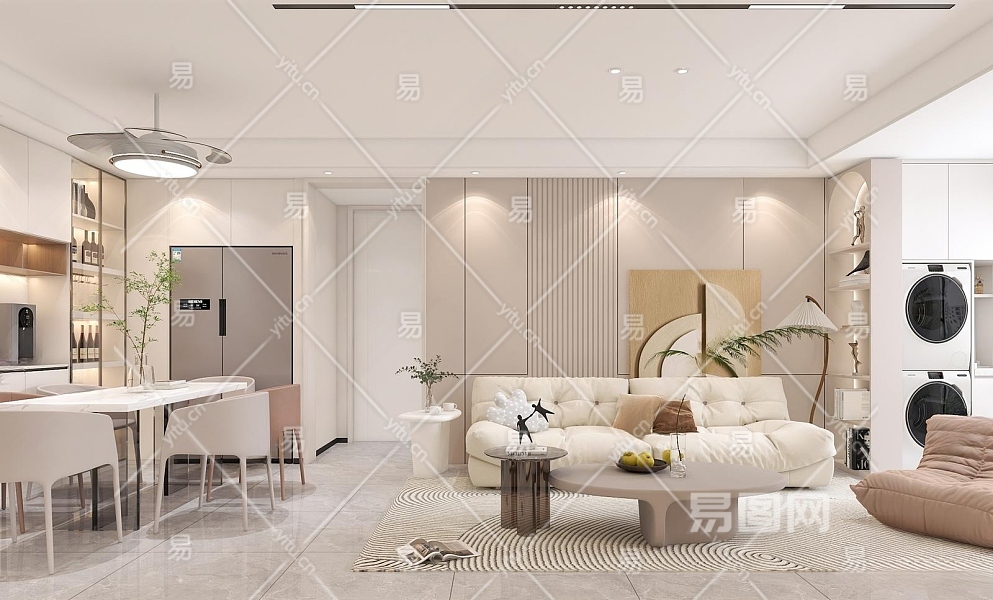 现代奶油风客餐厅3D模型下载