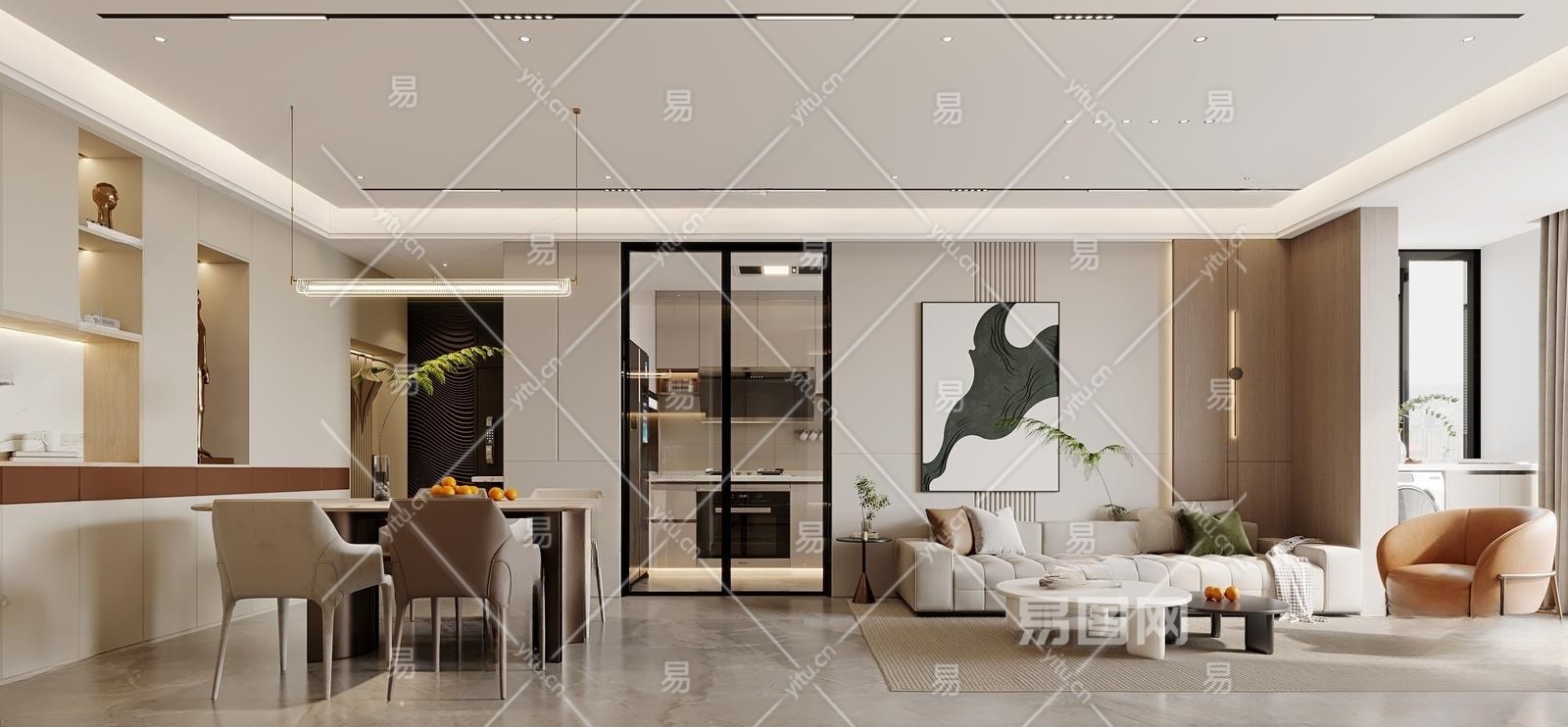 现代奶油风客餐厅3D模型下载