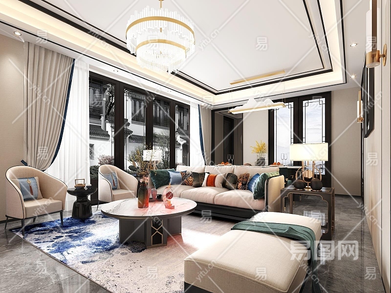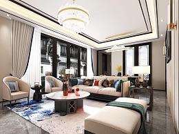 新中式轻奢别墅客餐厅3D模型下载