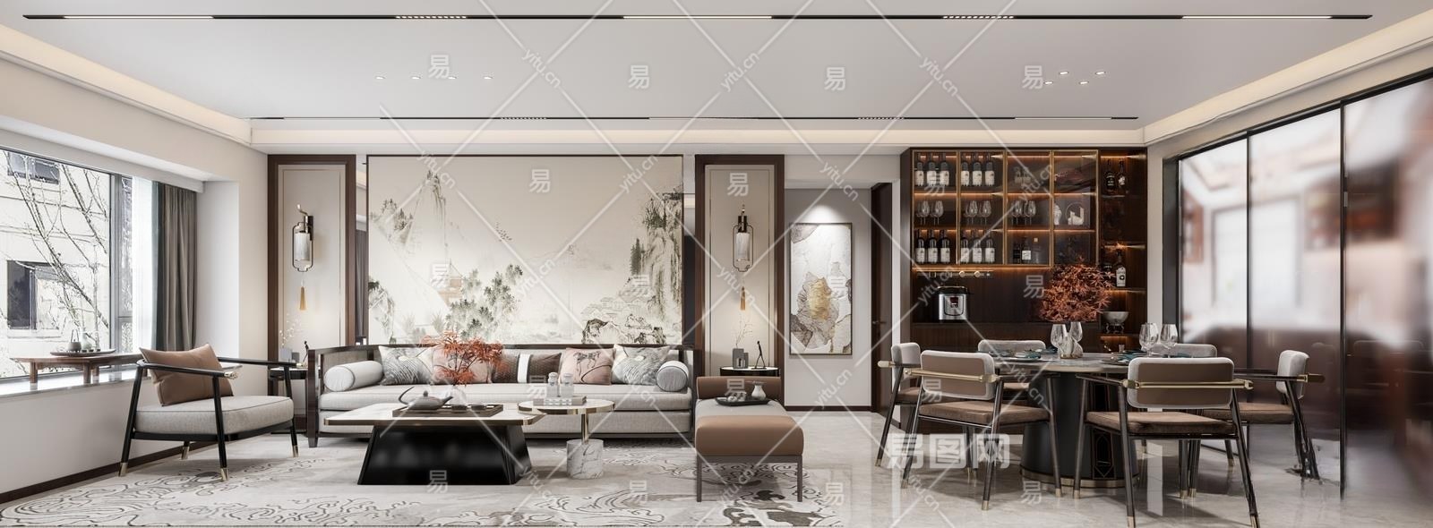 新中式客餐厅3D模型下载