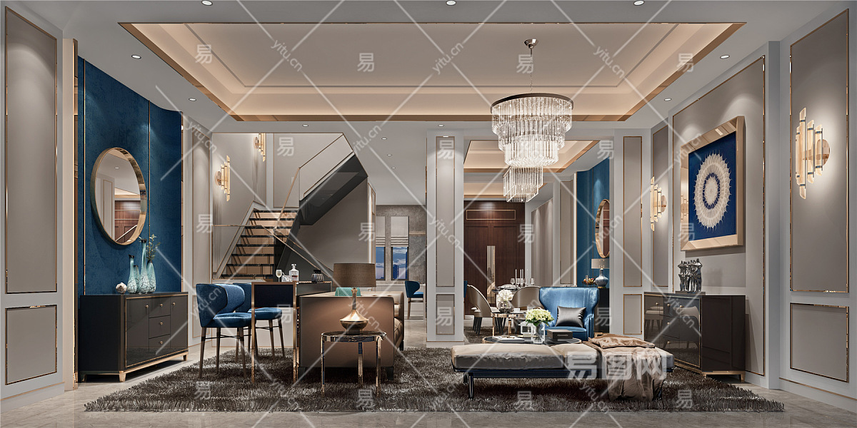 欧式古典客餐厅 吊灯壁灯 沙发茶几 餐桌椅 雕塑摆件 酒柜