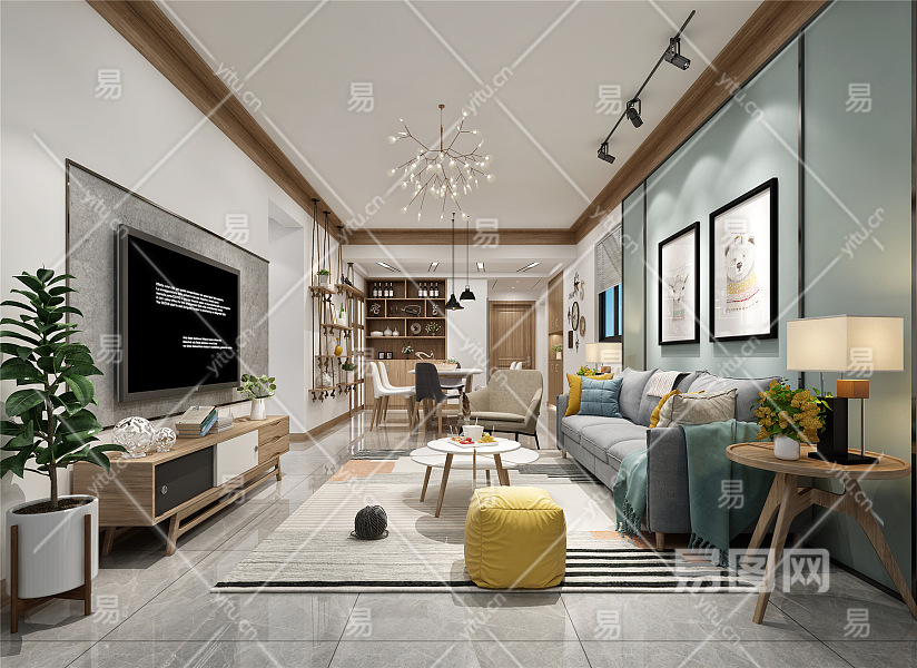 简欧客餐厅 餐桌餐椅沙发沙发凳电视柜吊灯挂画摆件