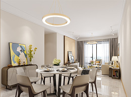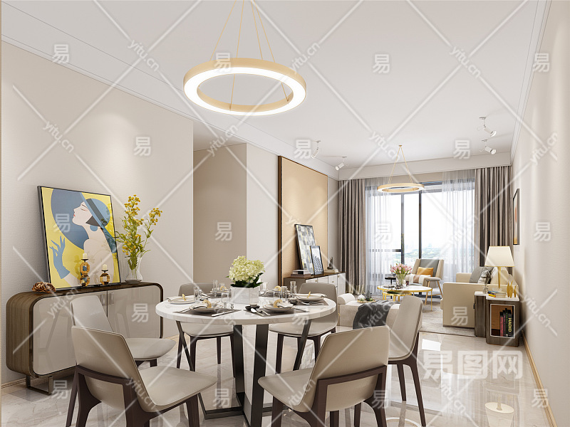 现代客餐厅 吊灯 台灯 餐桌椅 沙发茶几 盆景绿植 窗帘
