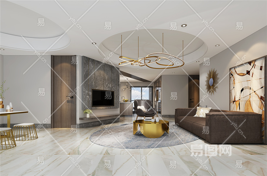 现代客餐厅 吊灯 金属墙饰 厨房 餐桌椅 沙发茶几 挂画电视柜