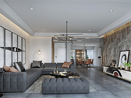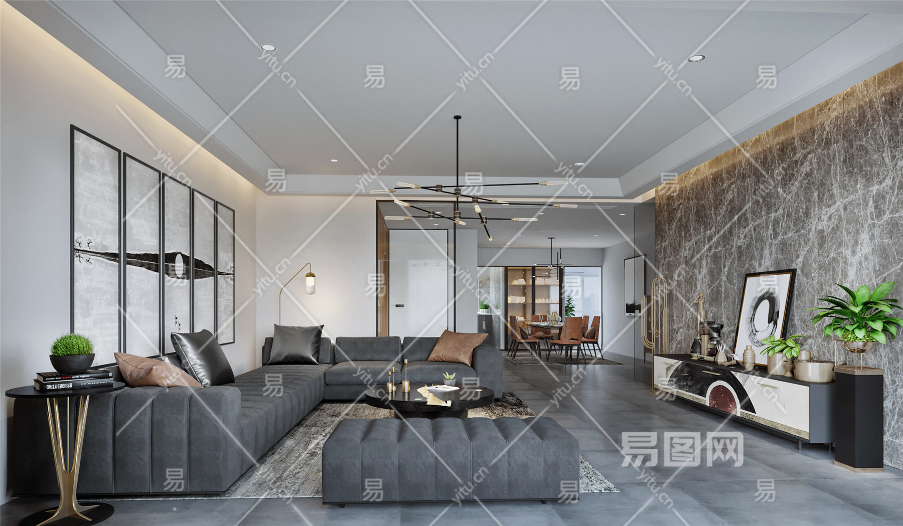 现代客餐厅 沙发 茶几 餐桌椅 壁挂画 吊灯 电视背景墙 酒柜-2