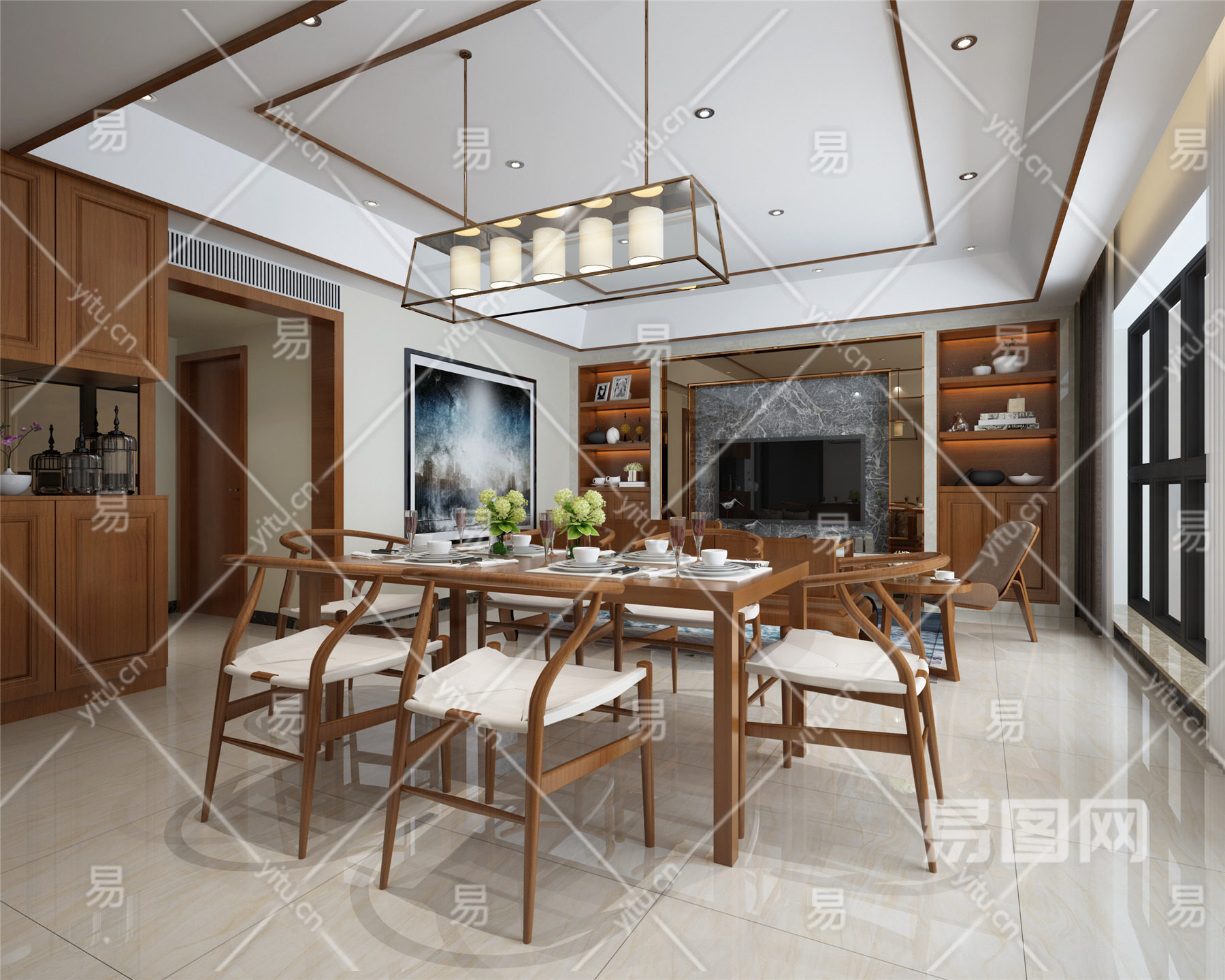 当前的位置:首页 > 3D模型 > 家装空间 > 客餐厅 > 新中式 中式客餐厅 餐桌椅 沙发 休闲椅 吊灯 装饰画 电视