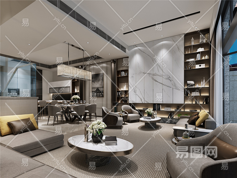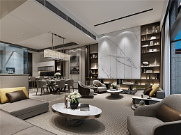 现代轻奢客餐厅 吊灯 背景墙 沙发茶几 餐桌椅 装饰书柜