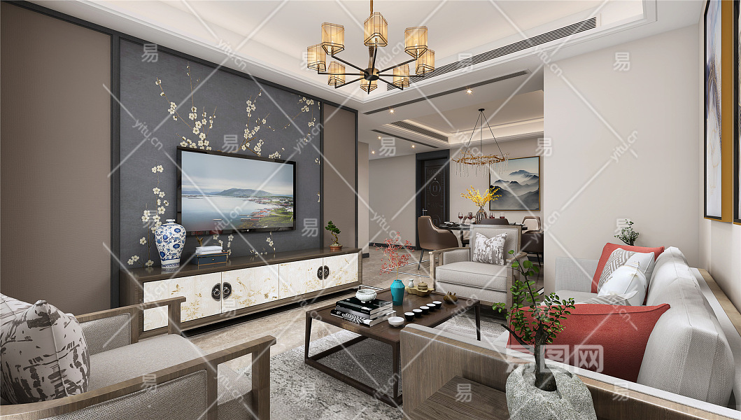 新中式客餐厅 电视柜 沙发 茶几 餐桌椅 绿植盆景 花瓶摆件