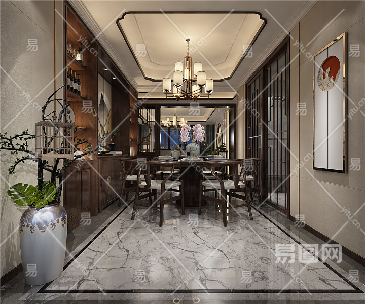 传统中式餐厅 餐桌 餐椅 餐边柜 吊灯 挂画-3