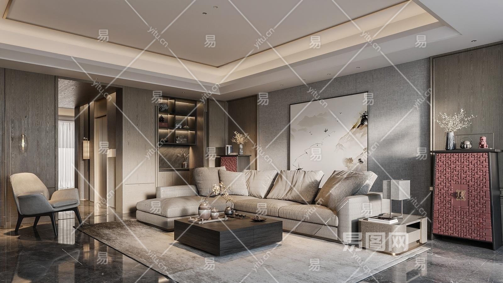 新中式客厅3D模型下载