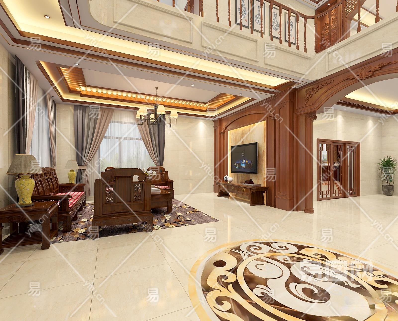 中式挑空客餐厅3D模型下载