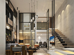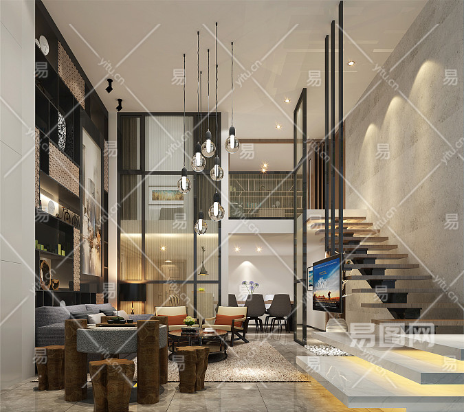 后现代客厅 沙发 茶室 茶桌 茶几 吊灯 楼梯 餐桌