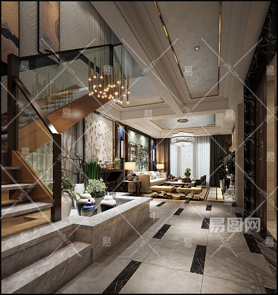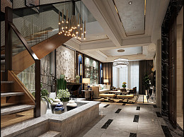 后现代 轻奢客厅 沙发 茶几 吊灯 楼梯花园