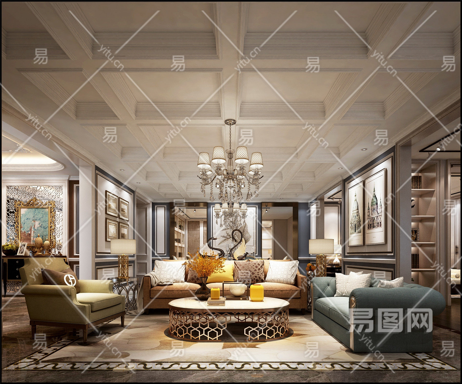 当前的位置:首页 > 3D模型 > 家装空间 > 客厅 > 简欧客厅 玄关 沙发组合 吊灯 台灯 摆件