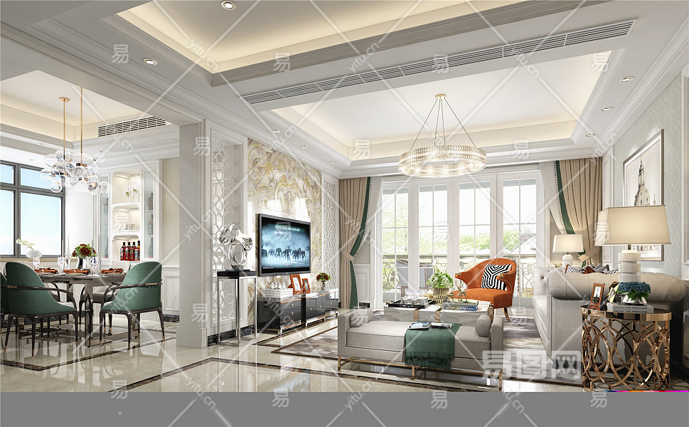 欧式简约客厅 沙发 茶几 电视柜 吊灯-3