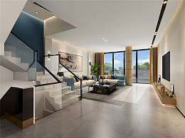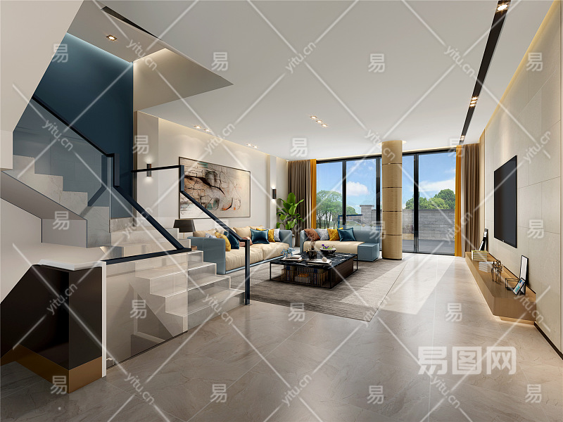 现代别墅客厅 沙发茶几 电视背景墙 庭院 楼梯壁灯 绿植