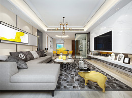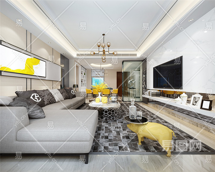 现代简约客厅 沙发 落地灯 茶几 地毯 电视柜 挂画