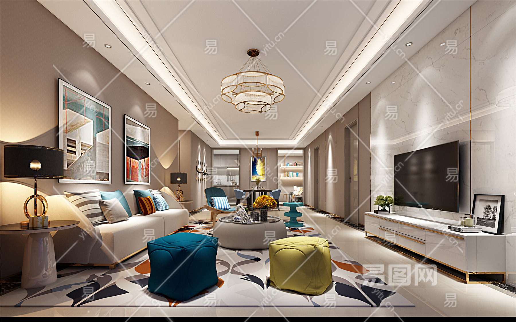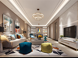 现代客厅 沙发组合 吊灯 台灯 茶几 电视柜 装饰品 窗帘-1