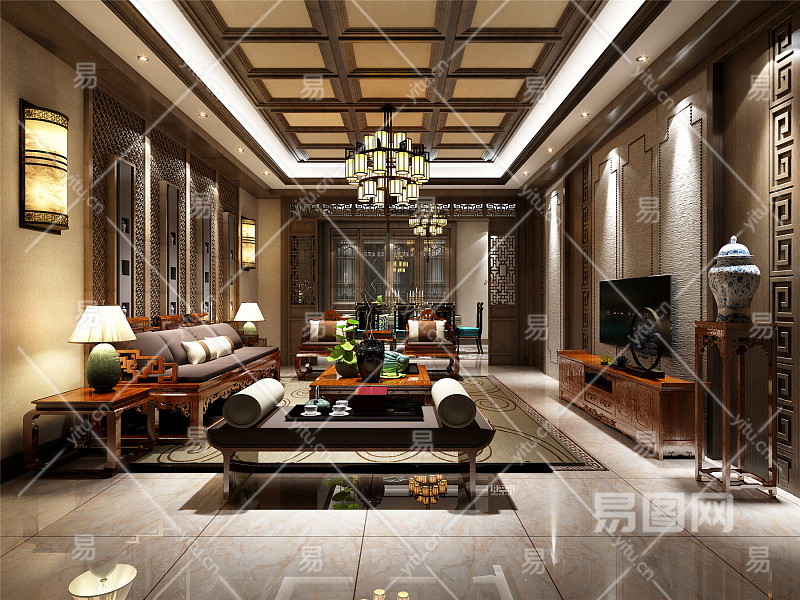 现代中式客厅 沙发 装饰品 茶几 地毯 窗帘 挂画 吊灯 壁灯