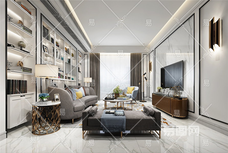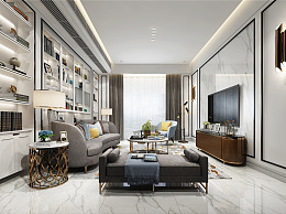 现代样板房客厅 电视柜 落地灯 壁灯台灯 沙发茶几 书架
