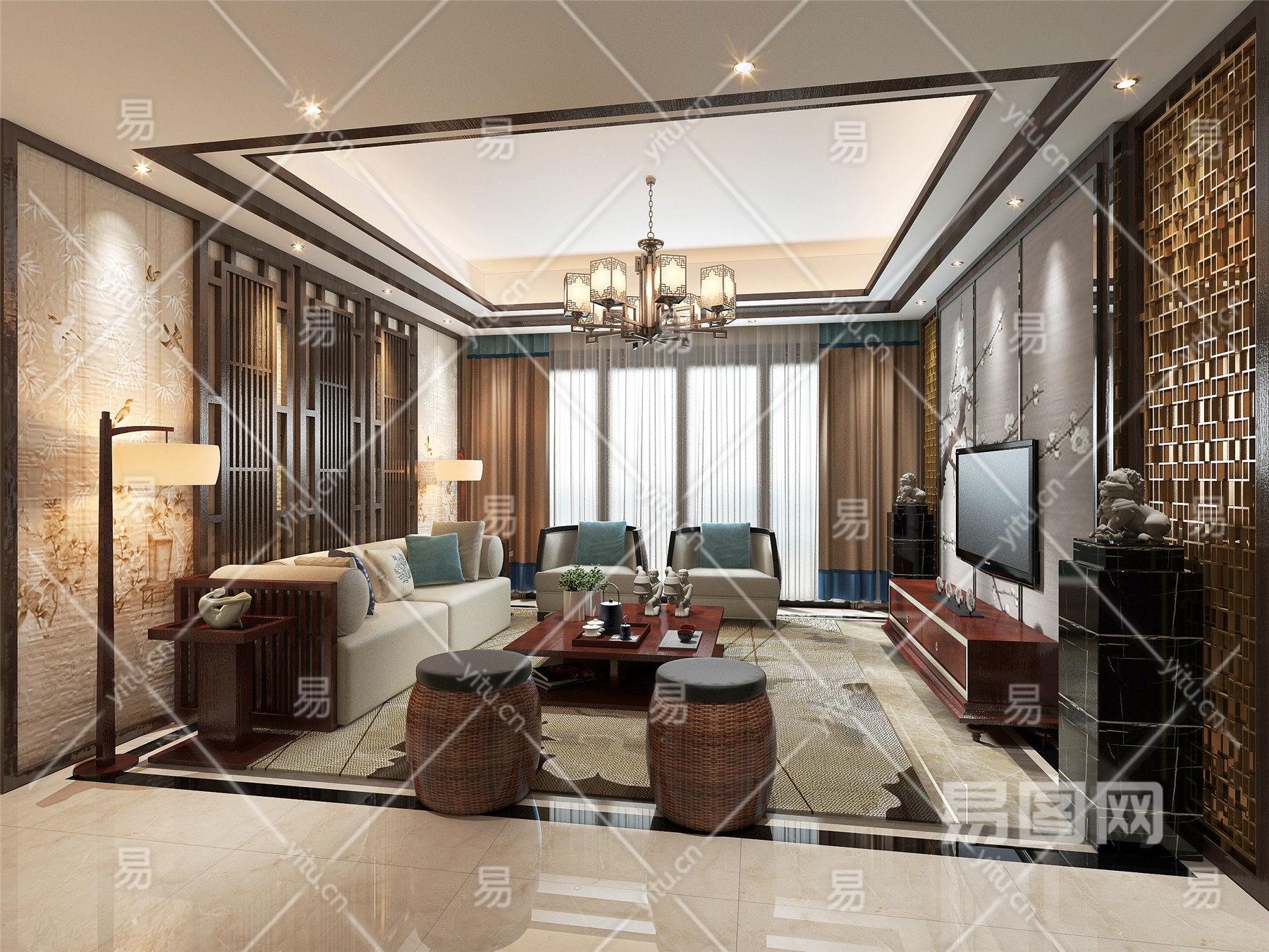 新中式客厅 沙发 灯具 背景墙