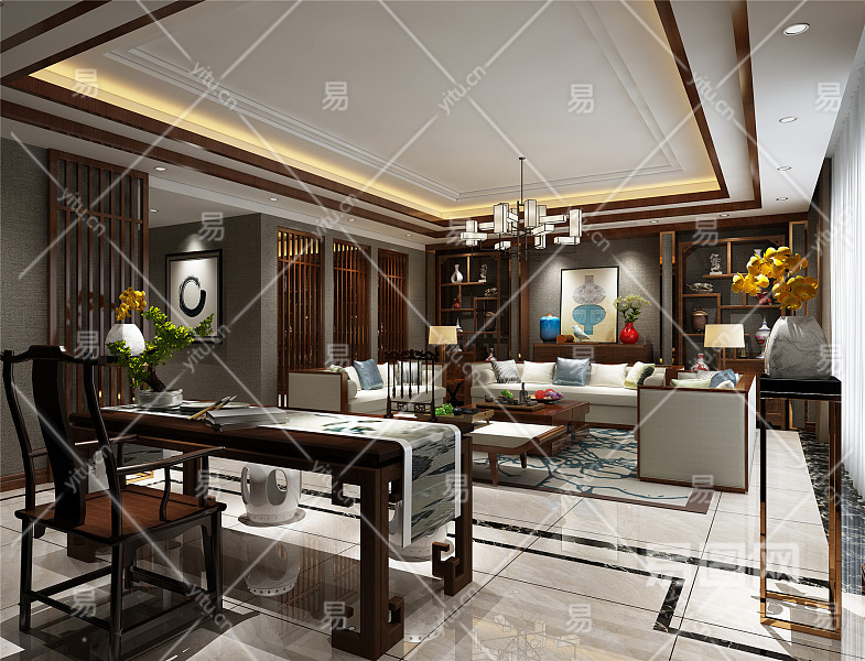 新中式客厅 沙发组合 吊灯 书桌 画 摆件