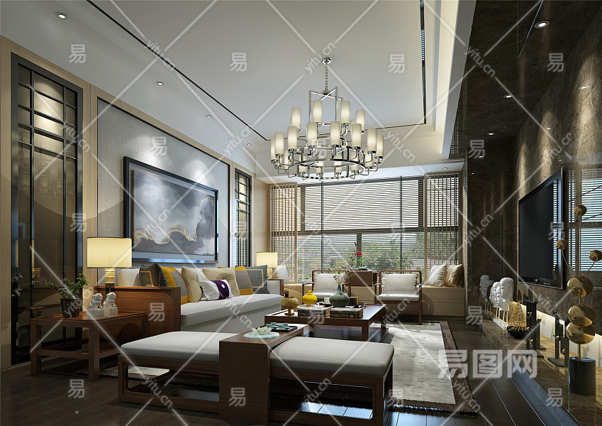 新中式客厅 沙发组合 吊灯 台灯 画 摆件