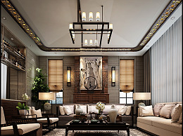 新中式客厅 沙发组合 吊灯 壁灯 台灯
