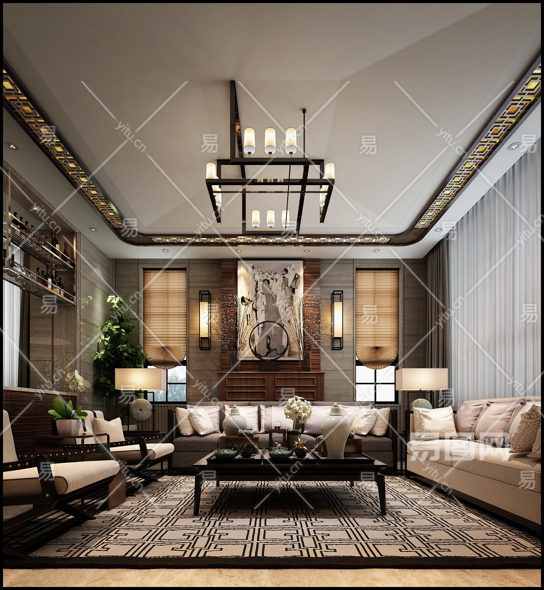 当前的位置:首页 > 3D模型 > 家装空间 > 客厅 > 新中式客厅 沙发组合 吊灯 壁灯 台灯