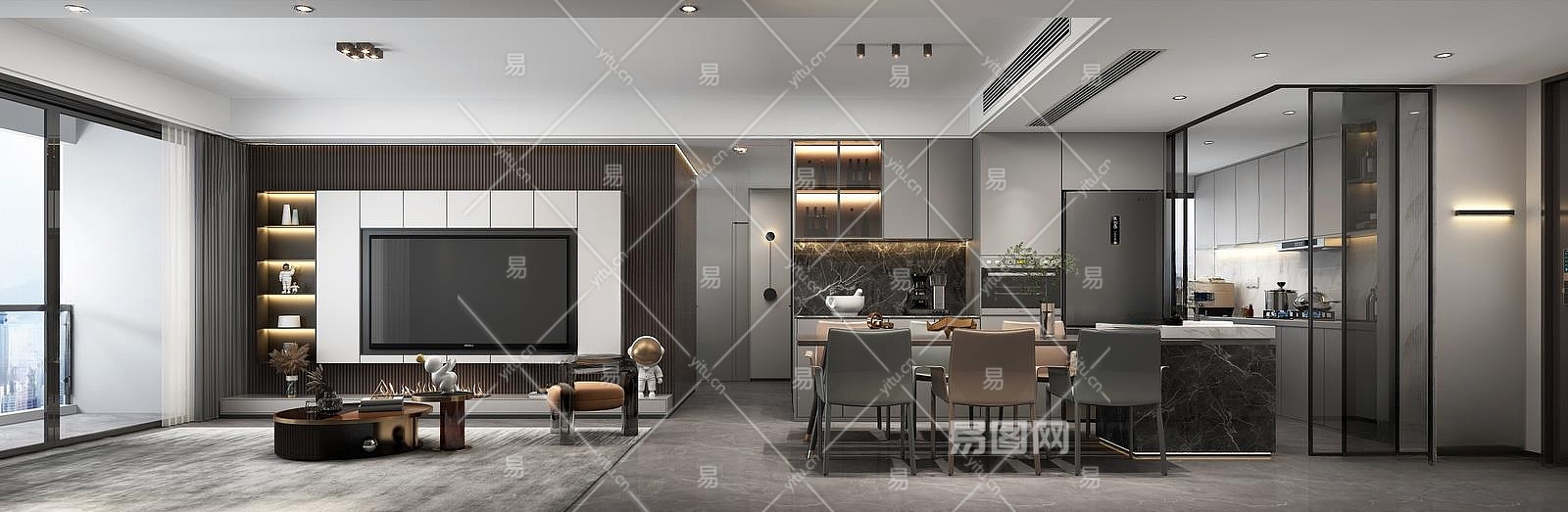 现代黑白灰客餐厅3D模型下载