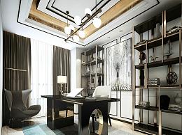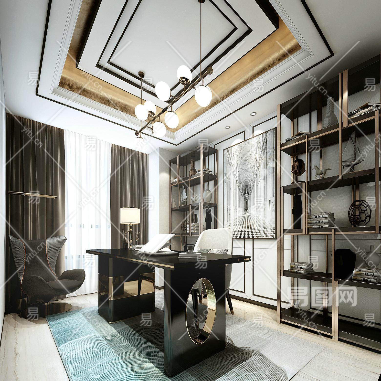 现代轻奢书房 书架 吊灯