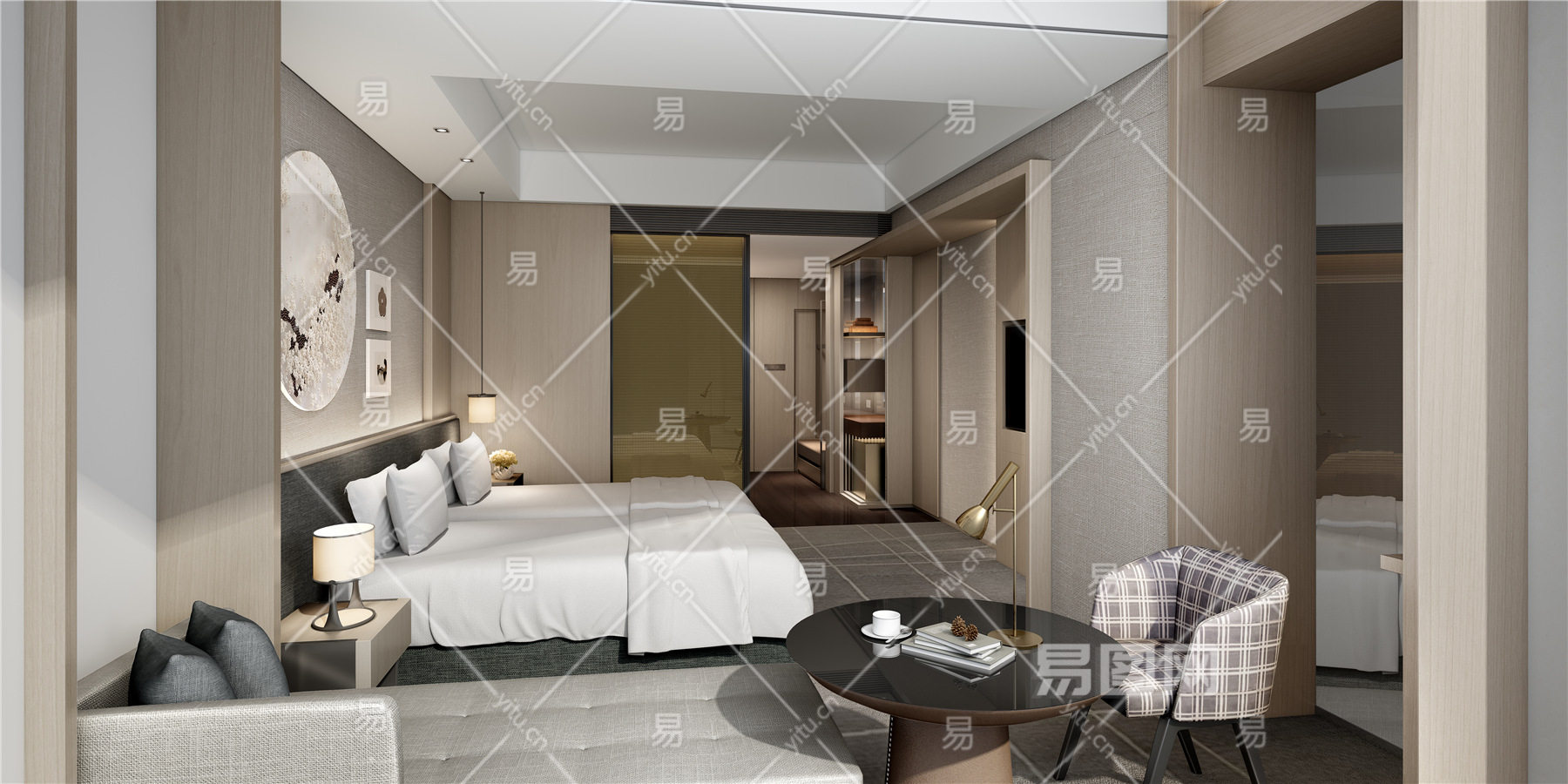 现代酒店客房 电脑桌 休闲沙发 双床房 卫生间