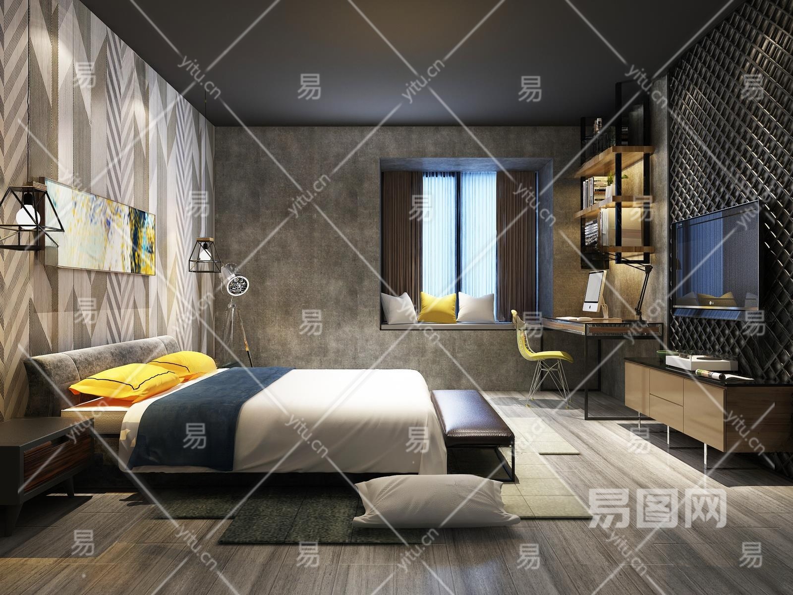 工业风家居卧室3D模型下载
